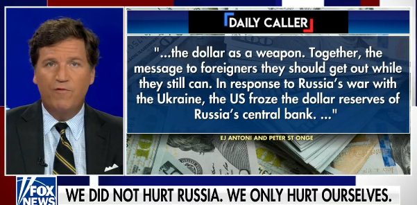 他引用了美国保守派新闻网“每日通讯”(The Daily Caller)一篇分析文章的内容,指出美元“武器化”暴露美国政府有可能会侵犯外国人合法拥有的美元资产,“劝退”他国:“储备货币的一个关键特征是它的非政治性,在美国两党用通货膨胀破坏了美元的稳定性之后,拜登政府正在破坏这一特性。将美元‘武器化’就是向外国人发出一个信息,那就是他们应该在还能离开的时候赶紧离开。”