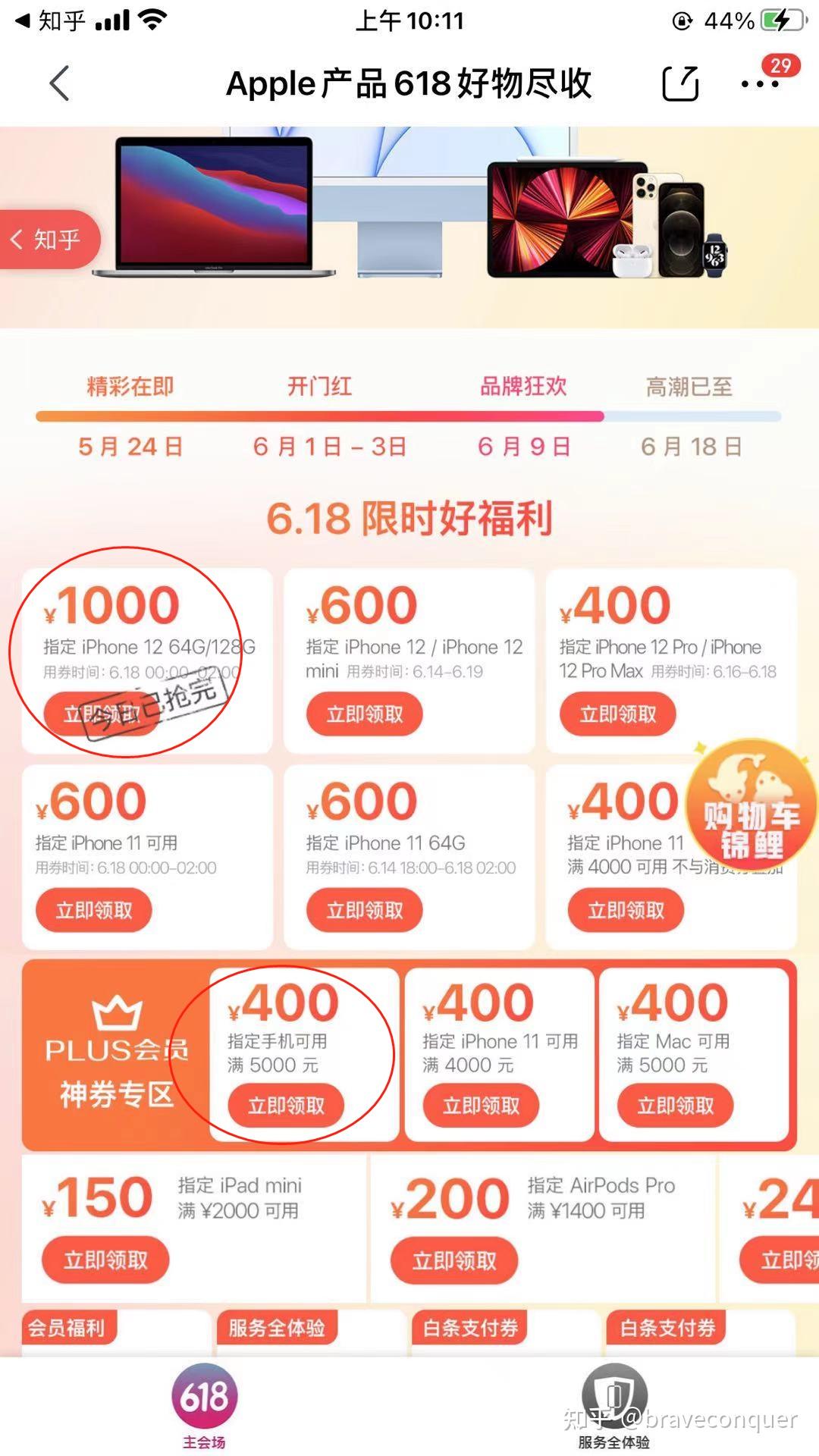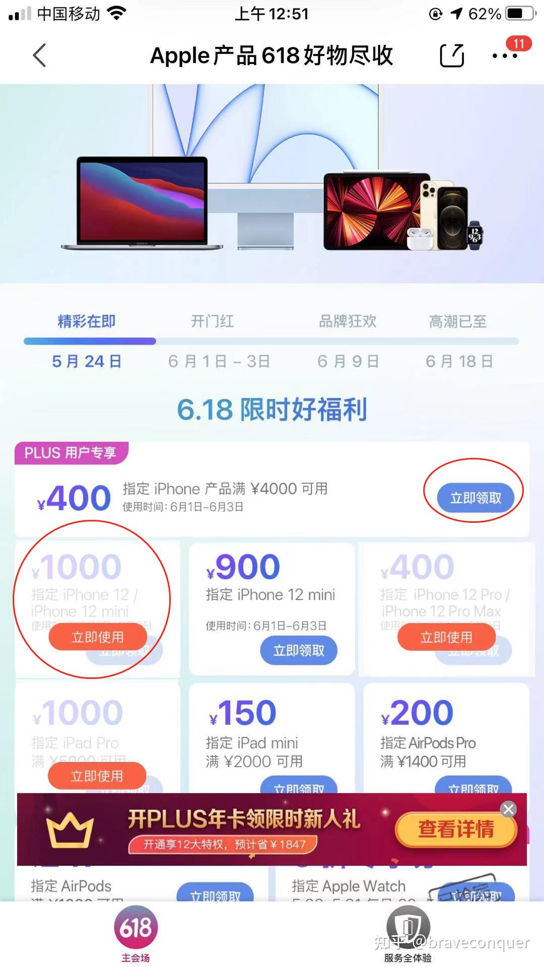 iPhone12手机的1000元神劵以及400元神劵再次到来,错过了6月1日到6月3日的朋友,这次盯紧点,提前把画红圈的这些劵抢了,避免到618当天抢不到。