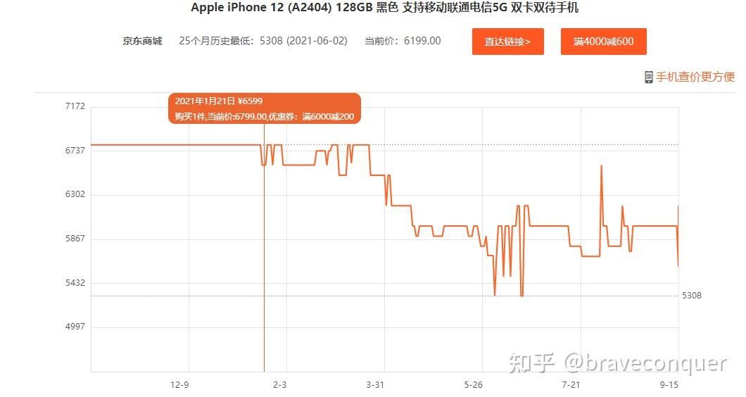 再看看iPhone12,在10月14日以首发价6799开卖,然后直到第二年也就是今年的1月21日降价才降了400。不管是双十一还是双十二都没有任何优惠。