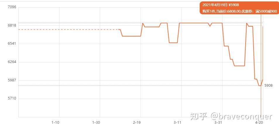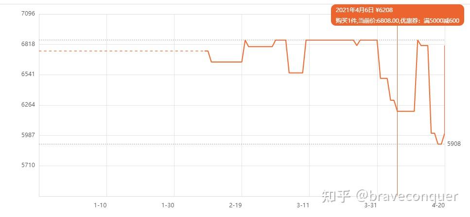 如图所示,之前低价还是在4月10日开始的满4000减600的优惠,然后在418这个小电商节这天快充套装到手价为5908,随后从4月19日开始变成了到手价位6008元。不少小伙伴是不是感觉错过了1个亿,我在回答里强调过优惠不会持续很久,因为小电商节,各大平台也越来越重视了!