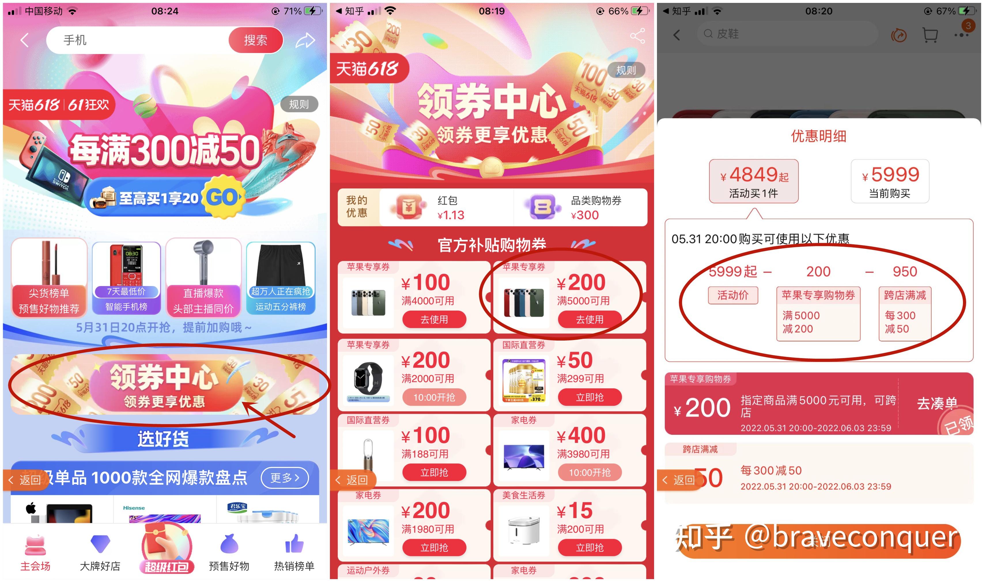 先说在天猫买iPhone手机怎么省钱,天猫这边首先可以先点击下方链接抢完红包后进入主会场,然后按照下图所示从左到右把指定的200元优惠券领了!