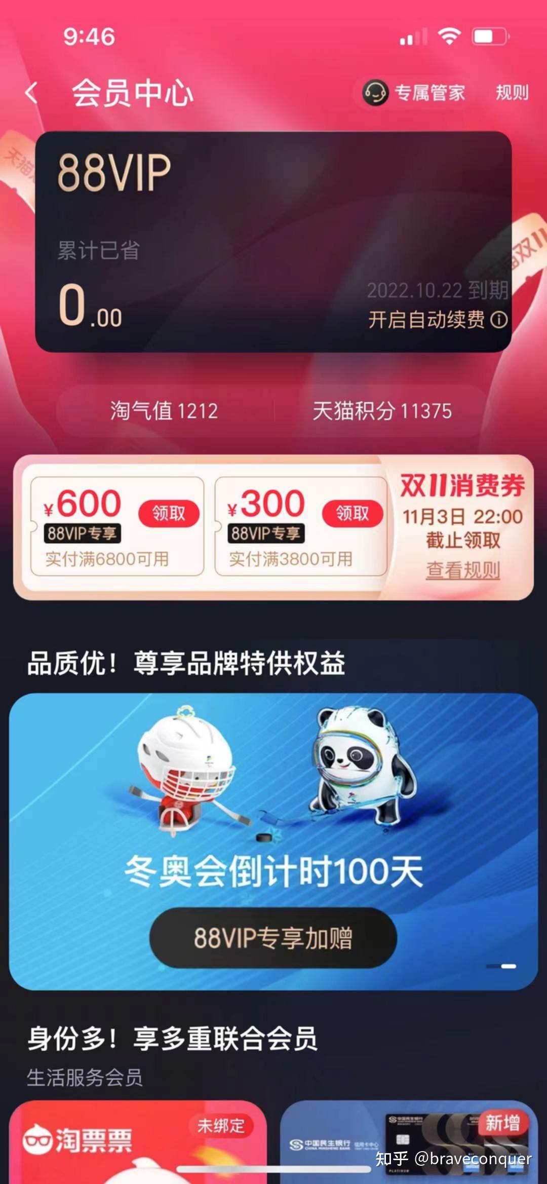 有朋友不知道怎么开启88VIP的,先淘宝搜索88VIP,点击进去,淘气值在1000以上的,可以用88买一年会员服务,如果淘气值是800,趁现在天猫双十一可以冲刺任务,随便买些东西就可以加几十分。