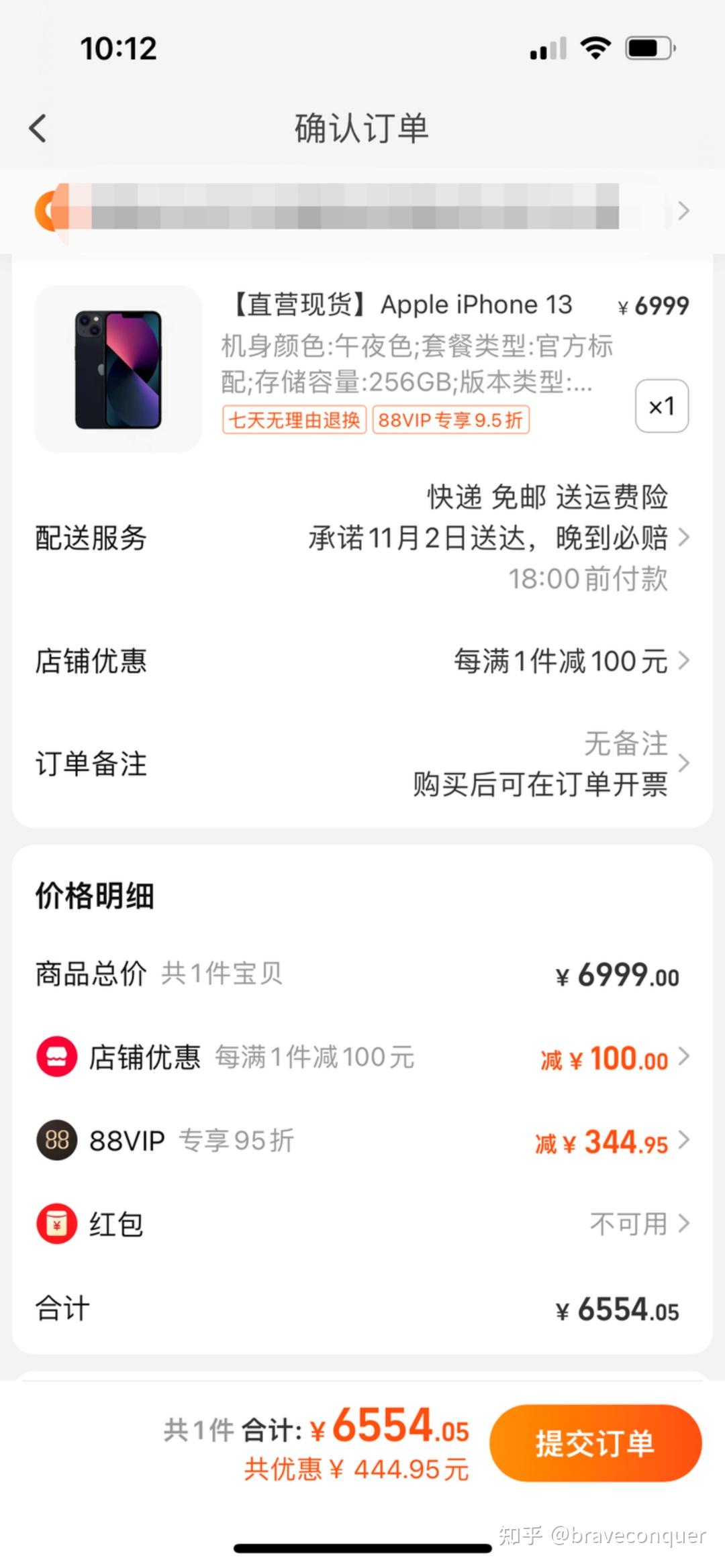 这家店优势在于用了88VIP劵付尾款后,店铺满5000减100,还送硅胶保护套+原装快充+90天碎屏保,这一套下来得省个200-300人民币了。然后如果256G的iPhone13在淘宝店再凑1元后,付款的价格是6099元。