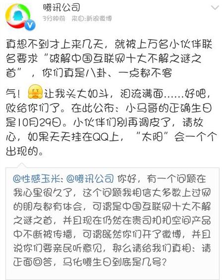 中国互联网十大不解之谜之首终于有解了! 腾讯CEO马化腾 正确生日是1971年10月29日出生。 【今天是腾讯CEO马化腾生日,转发几个群能升级到太阳。】 今天是知乎CEO周源生日,转发点赞的话……就会进小黑屋……→→ 参考资料: [1] [2]