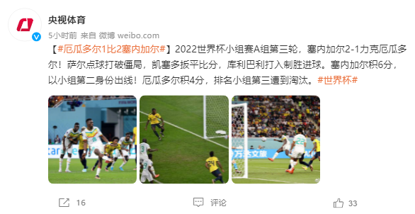2022世界杯小组赛A组第三轮,塞内加尔2-1力克厄瓜多尔!萨尔点球打破僵局,凯塞多扳平比分,库利巴利打入制胜进球。塞内加尔积6分,以小组第二身份出线!厄瓜多尔积4分,排名小组第三遭到淘汰。