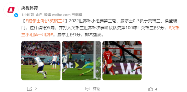 2022世界杯小组赛第三轮,威尔士0-3负于英格兰。福登破门,拉什福德双响,并打入英格兰世界杯决赛阶段队史第100球!英格兰积7分,英格兰小组第一出线。威尔士积1分,排名垫底。