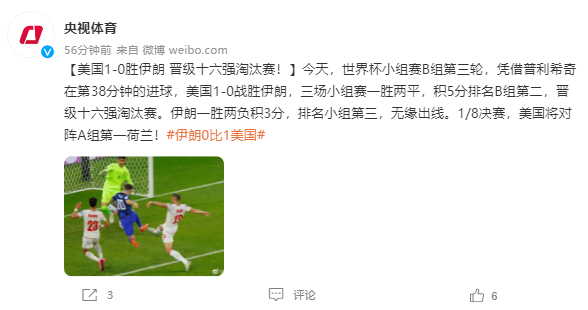美国1-0胜伊朗,晋级十六强淘汰赛!