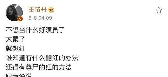 2010年,沉寂了很久的王珞丹在社交平台发布了一则消息,称其不想当演员了,就想红,求一个有尊严的翻红方法。