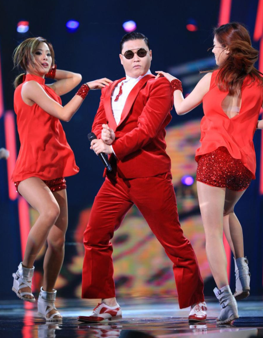 虽然舞姿不是很优美,但是PSY的身材却受到了大家的关注。久未露面的他似乎受了很多对比,他在《江南style》当中的造型。
