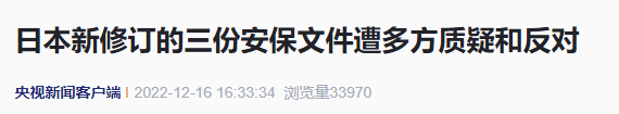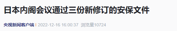 12月16日,日本政府在当天举行的内阁会议上通过了修改后的《国家安全保障战略》《国家防卫战略》《防卫力整备计划》三份安全保障文件。