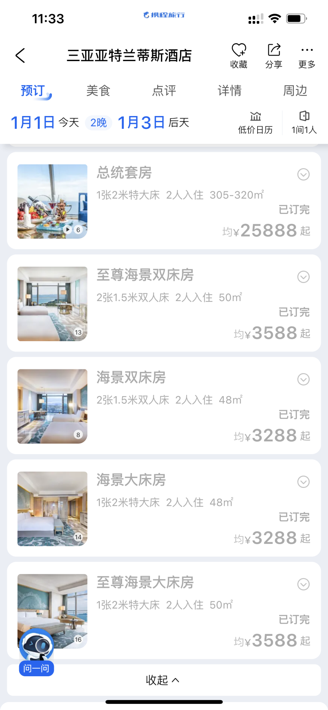 以三亚亚特兰蒂斯酒店为例,澎湃新闻搜索2023年1月1日至1月3日的酒店发现,包括过两万元售价的总统套房、至尊海景大(双)床房、海景大(双)床房均已订完。