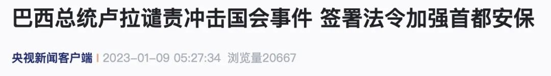 当地时间1月8日傍晚,巴西总统卢拉针对在首都巴西利亚发生的冲击国会及其他政府机构事件发表讲话。讲话中,卢拉对相关事件予以强烈谴责,并称将尽快查明并严惩事件责任人。