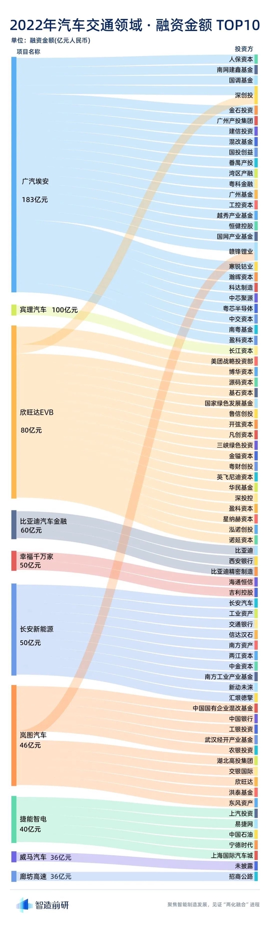 在 2022 年汽车交通行业单笔融资金额排名前 10 的事件里,汽车研发和制造企业占据 7 席且融资金额均超过 30 亿元,广汽埃安以高达 183 亿的融资金额当之无愧的拿下年度最大单笔融资,廊坊高速以 36 亿元的金额守住前 10 的大门,成为唯一上榜的基础设施类企业。位于重庆的出行运力服务商“幸福千万家”以 50 亿元的融资额领跑出行服务行业,或成为新的行业黑马。