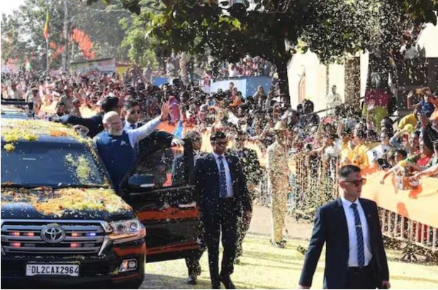 按计划,莫迪进行路演。期间,一个身穿红色上衣的男孩突然跳出护栏冲向莫迪,距离莫迪只有一臂距离,据称他是试图给莫迪送上一个花环。当时,莫迪踩在汽车踏板上,身体处在缓慢行进的SUV车外,正在对路边人群挥手致意。车辆边上两名身穿西装的保镖迅速冲上去拦阻小男孩,另外几名安保人员将小男孩架离。印媒称,莫迪收下了花环,放到了他的车里。