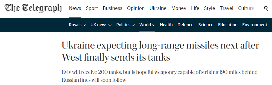 英国《每日电讯报》也引用乌克兰官员的话表示,在获得西方坦克后,预计乌克兰还将获得远程导弹,以打击俄军防线后近200英里的地区。“这些先进的武器系统将用于打击俄罗斯脆弱的供应链,打击弹药库、仓库和其他对支持其军事行动至关重要的基础设施。”