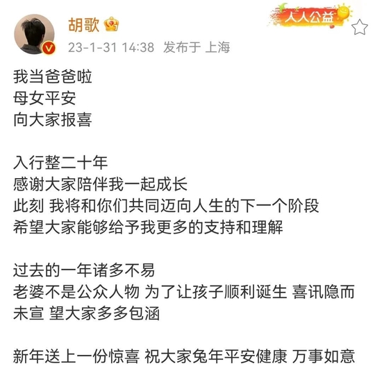 1月31日下午,演员胡歌发布微博,官宣当爸,随即相关词条登上热搜榜第一。