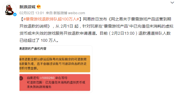 截至2月2日13时,在暴雪游戏服务中心的退款渠道中申请退款的排队人数已超100万人。