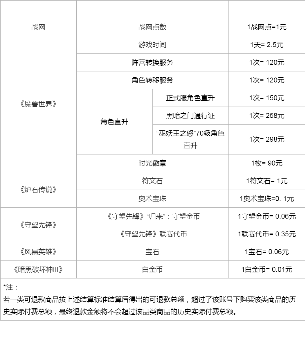 玩家需前往“暴雪游戏服务中心”公众号提交退款申请,最终退款金额将以停运后玩家账号内实际剩余的可退款商品数量为准,且不会超过该账号可退款商品的历史累计付费金额。