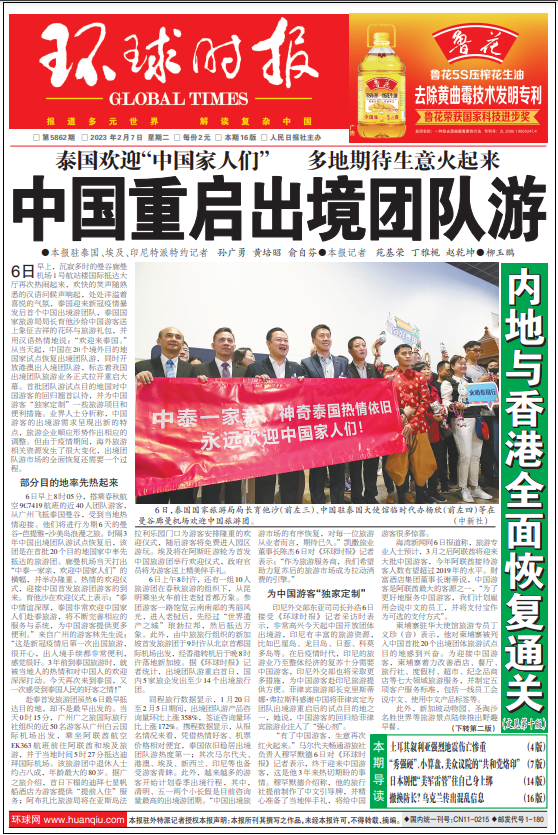6日早上8时05分,搭乘春秋航空9C7419航班的近40人团队游客,从广州飞抵泰国曼谷,受到当地热情迎接。他们将进行为期6天的曼谷-芭提雅-沙美岛浪漫之旅。时隔3年中国出境团队游试点恢复后,该团是在首批20个目的地国家中率先抵达的旅游团。廊曼机场当天打出“中泰一家亲,欢迎中国家人们”的横幅,并举办隆重、热情的欢迎仪式,迎接中国首发旅游团游客的到来。育他沙在欢迎仪式上表示:“泰中情谊深厚,泰国非常欢迎中国家人们赴泰旅游,将不断完善相应的服务与系统,为中国游客提供更多便利。”来自广州的游客林先生说:“这是新冠疫情后第一次出国旅游,很开心,出入境手续都非常便利,感觉很好。3年前到泰国旅游时,就被当地人的热情和对中国人的欢迎深深打动。今天再次来到泰国,又一次感受到泰国人民的好客之情!”