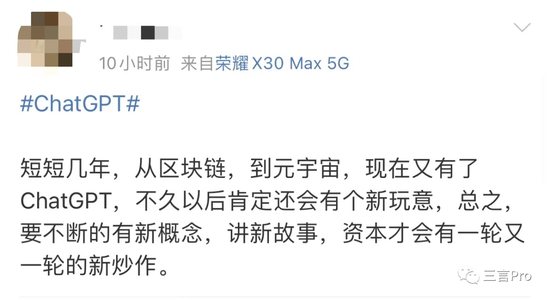 有网友称,短短几年,从区块链,到元宇宙,现在又有了ChatGPT,不久以后肯定还会有个新玩意,总之,要不断的有新概念,讲新故事,资本才会有一轮又一轮的新炒作。