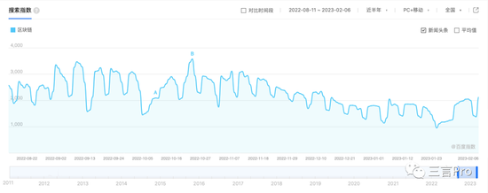 而“区块链”的微信指数,在去年8月底达到顶峰,日指数达到1800多万。此后也是大幅下降,偶尔出现一个小高峰。不过此次ChatGPT的爆火,却没能给“区块链”带来一波新的增长。