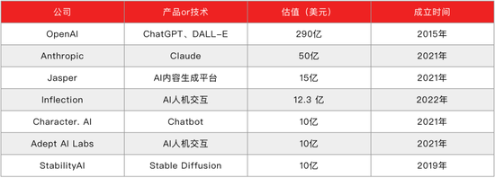 OpenAI凭借多年积累的大模型研发能力,以及GPT、DALL-E等产品,一枝独秀。而其他一众独角兽企业,虽然估值与OpenAI相去甚远,但无一不是在短时间内估值暴增,Jasper甚至只是一家基于OpenAI技术的服务商,估值也达到了15亿美元。Anthropic更是凭借创始人的GPT元老身份,以“ChatGPT最强竞品”的噱头,被危机中的谷歌看中,估值直逼50亿美元。