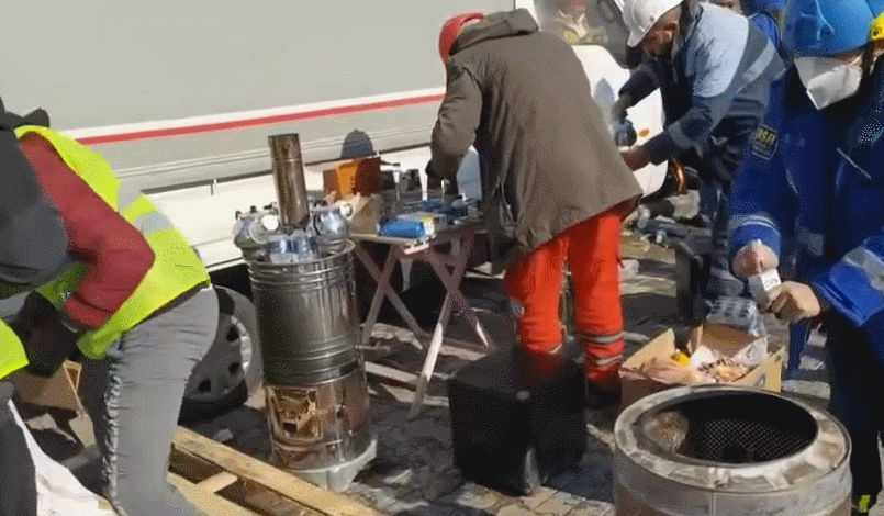 镜头中,当地人准备了汤和食物,趁冒着热气,赶紧分发给在严寒中奋战的救援队员。