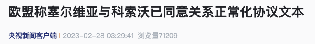 欧盟外交与安全政策高级代表博雷利当地时间2月27日表示,塞尔维亚和科索沃当局代表对欧盟起草的关系正常化协议文本没有异议,该协议将很快在欧盟官网公布。当天,博雷利在布鲁塞尔分别会见了塞尔维亚总统武契奇和科索沃当局领导人库尔蒂。