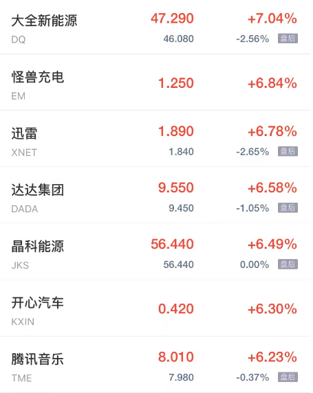 科技涨超11%,满帮涨超10%,陆金所控股涨超8%,能链智电、360数科涨超7%,、、集团、、、格林酒店、携程涨超6%,亿咖通科技、BOSS直聘、、、有道、、阿特斯、、网易涨超5%,、、、、、涨超4%,优克联、高途、汽车、、万国数据涨超3%,亚朵集团、、、、、量子之歌、、、挚文集团、、欢聚集团、涨超2%,、、、、、名创优品、、水滴公司、涨超1%。