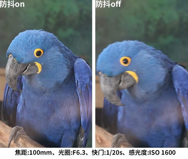 使用EOS R50搭配这枚镜头拍摄位于室内暗光环境下的鹦鹉,使用相同摄影参数开启IS和关闭IS各拍摄一张。可以看到在远低于安全快门的情况下拍摄,开启防抖可以获得清晰稳定的画面。这枚镜头的光学防抖约为4.5级,搭配具备防抖系统的机身时,协同防抖可达7级。