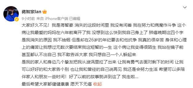 蒋智豪今年26岁,他在微博中提到,“这个病让我最爱的妈妈在六年前离开了我,没想到这么快到我自己身上了。我不抽烟,但却在26岁的年纪要去和它抗争。我真的很辛苦……”