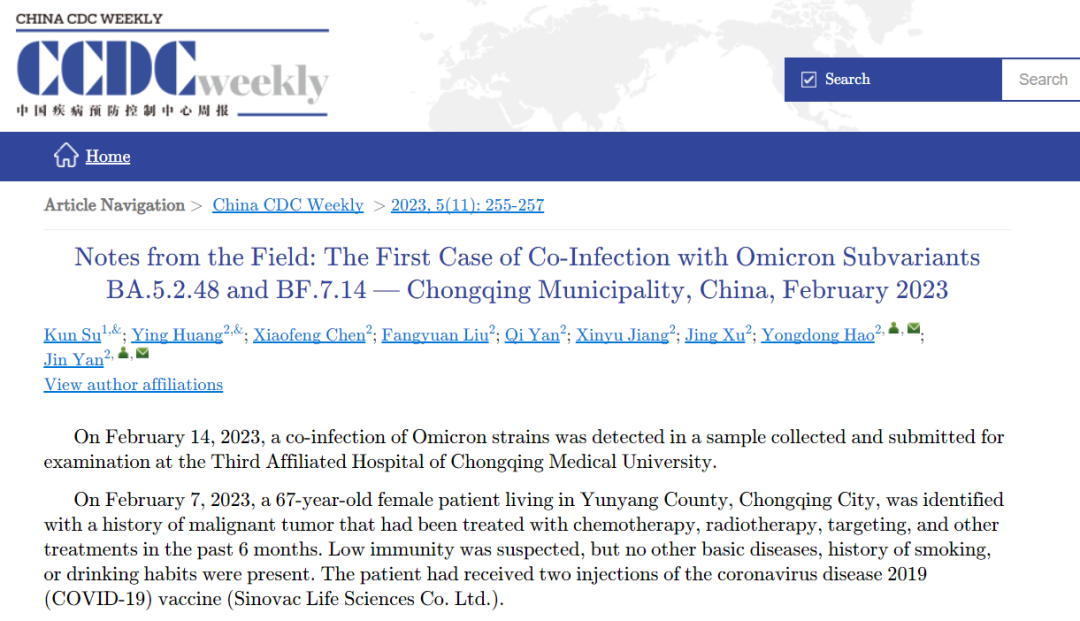 3月17日,中国疾控中心网站发布最新《中国疾病预防控制中心周报(China CDC weekly)》。周报称,2月14日,在重庆医科大学附属第三医院采集并送检的样本中检测到奥密克戎毒株的共同感染。