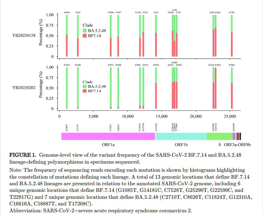 研究人员于2023年1月28日和2月7日从患者身上采集上呼吸道样本,分别命名为YB20230158和YB20230202,这两个样本形成了一个独立的分支,不同于奥密克戎亚变体BA.5.2.48和BF.7.14。突变位点分析显示,两个样本都含有奥密克戎亚变体BA.5.2.48和BF.7.14的特异性定义位点,患者同时感染了奥密克戎亚变体BA.5.2.48和BF.7.14。
