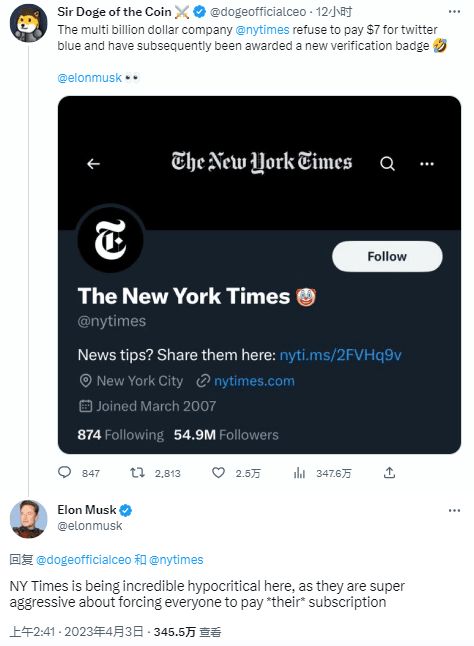 据美国《国会山报》报道,在《纽约时报》拒绝成为推特的付费用户后,推特CEO埃隆·马斯克当地时间4月2日取消了该媒体的认证标记,并嘲笑称,“《纽约时报》的真正悲剧在于,他们的政治宣传一点都不有趣”。↓